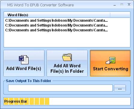 To begin the conversion process, simply click the “Start Converting” button on the Main Screen. Each .doc file in the “Word File(s)” list will be converted to a file in EPUB format and placed in the directory indicated by the “Save Output to this Folder” field. The “Progress Bar” at the bottom of the Main Screen will mark the completion of each conversion as shown below: