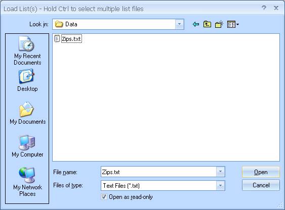 To do this, press the “Load City, State or Zip From File” button. This will display the dialog shown below: