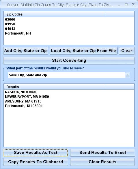 or more city and state to convert to a zip code. Pressing the “Start Converting” button starts